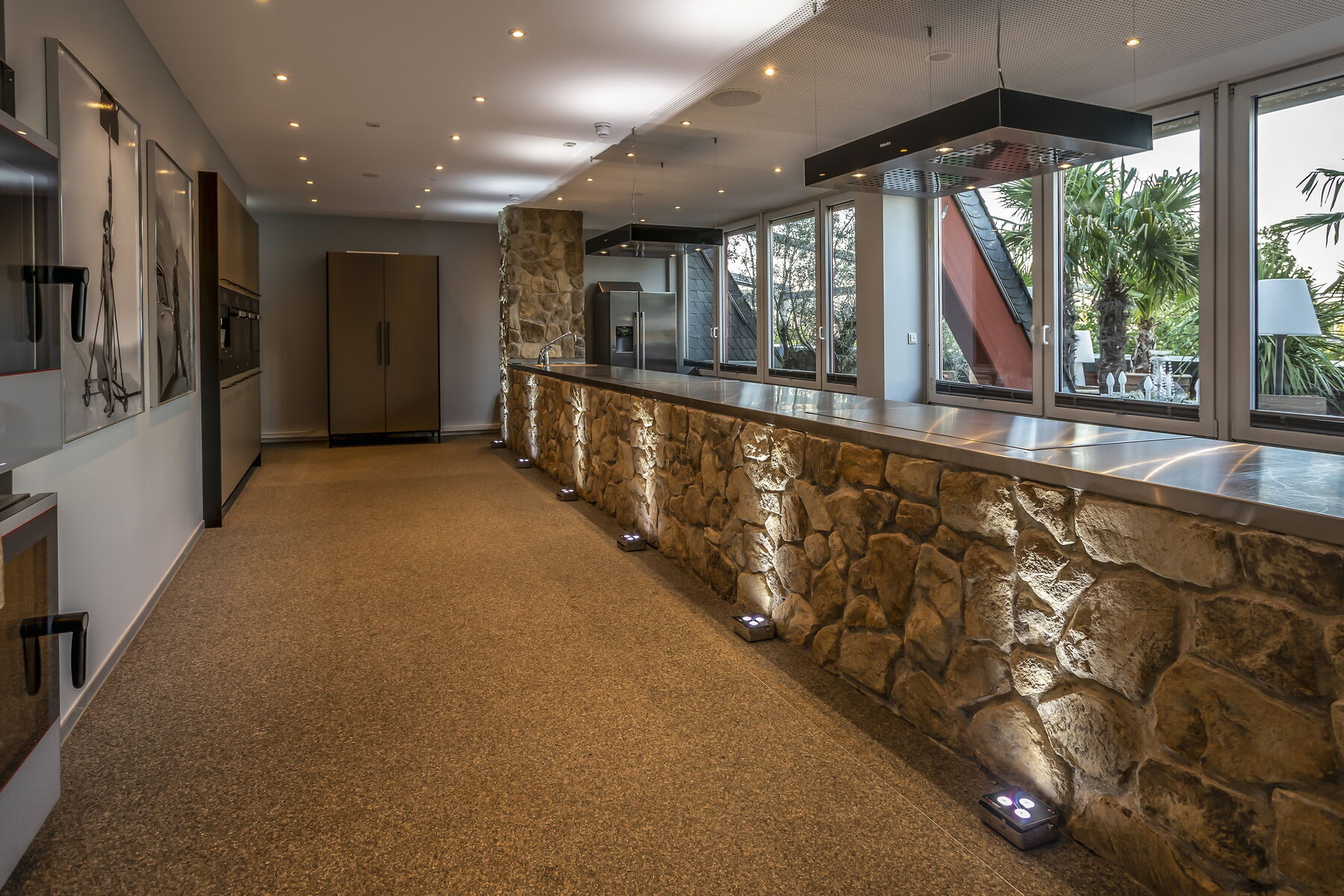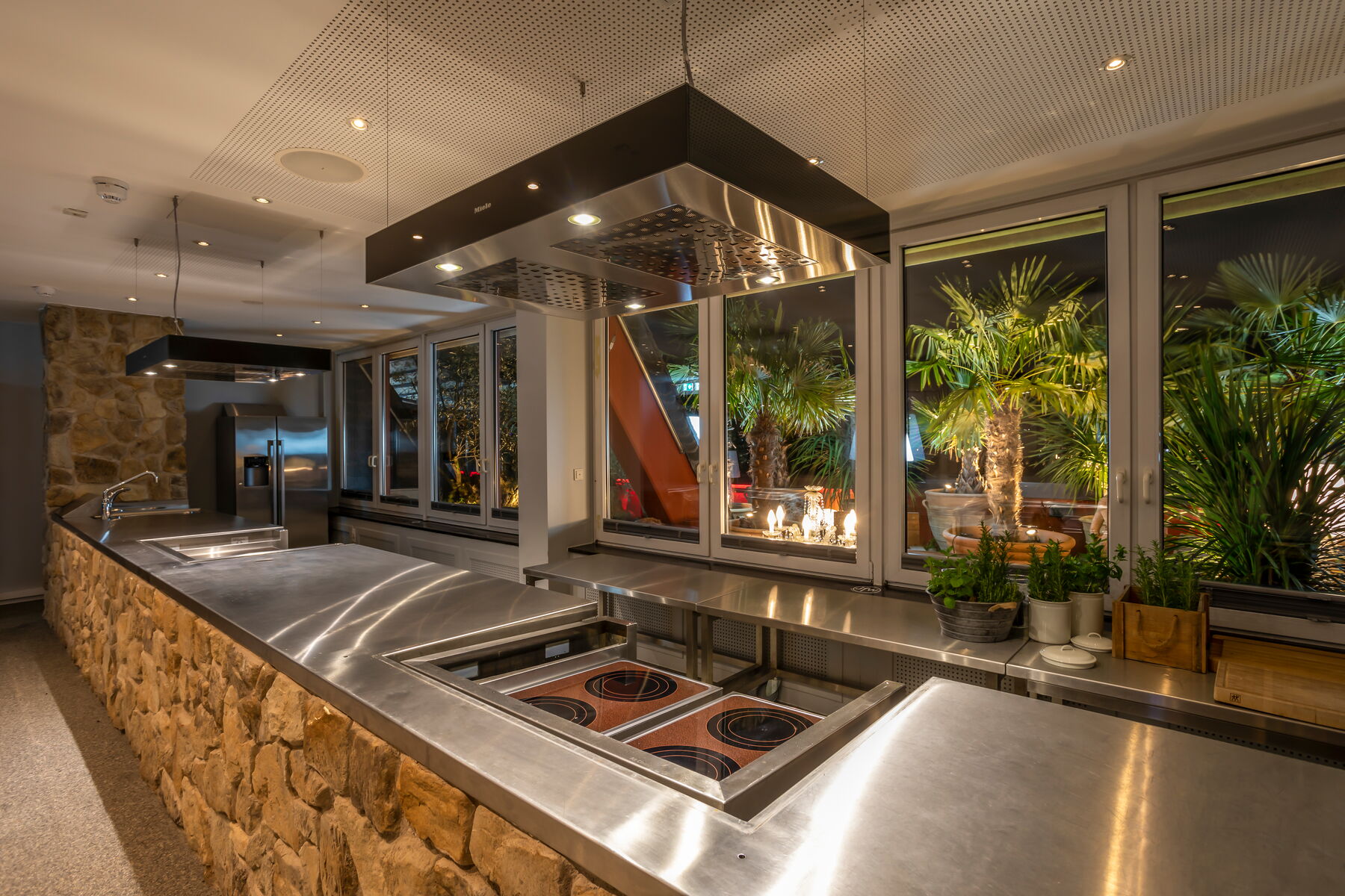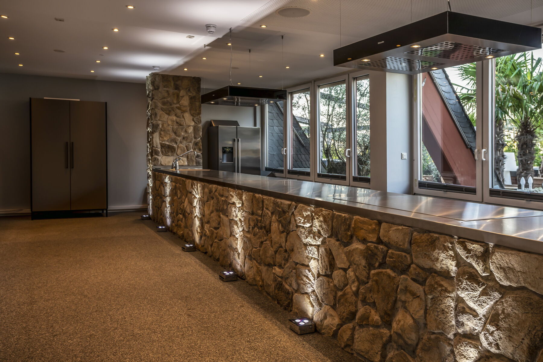 Kulinarische Bühne im Rheinloft Cologne: Die Showküche ist ideal für Live-Cooking, Tastings und Kochsessions – stilvoll inszeniert, kombinierbar mit Loft oder Penthouse und erweiterbar um die BBQ-Outdoor-Küchen auf dem Dachgarten.